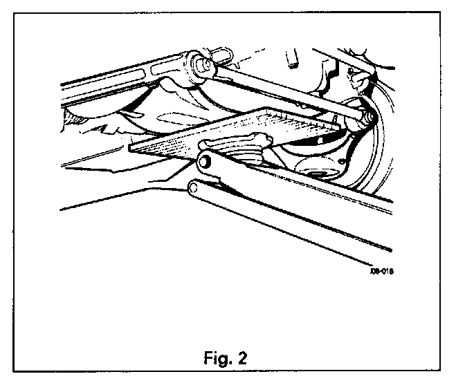 Position the jack centrally under the front cross member (Fig. 2), using a wooden block placed between the jack head and the crossmember. Place axle stands under both front jacking points when the vehicle has been raised.
