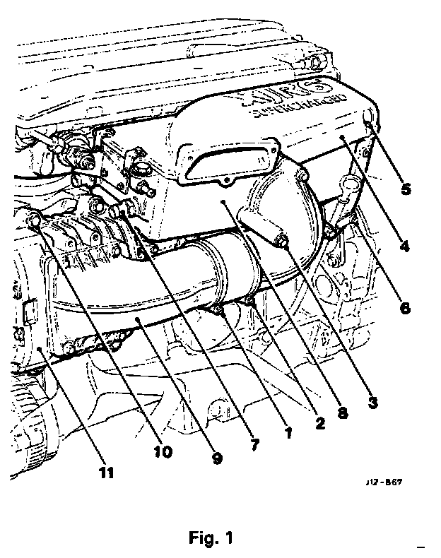 - Slacken the clamp securing the intake elbow hose to the supercharger outlet elbow (1 Fig. 1) and remove the hose. Remove the securing clamps and keep for reuse.