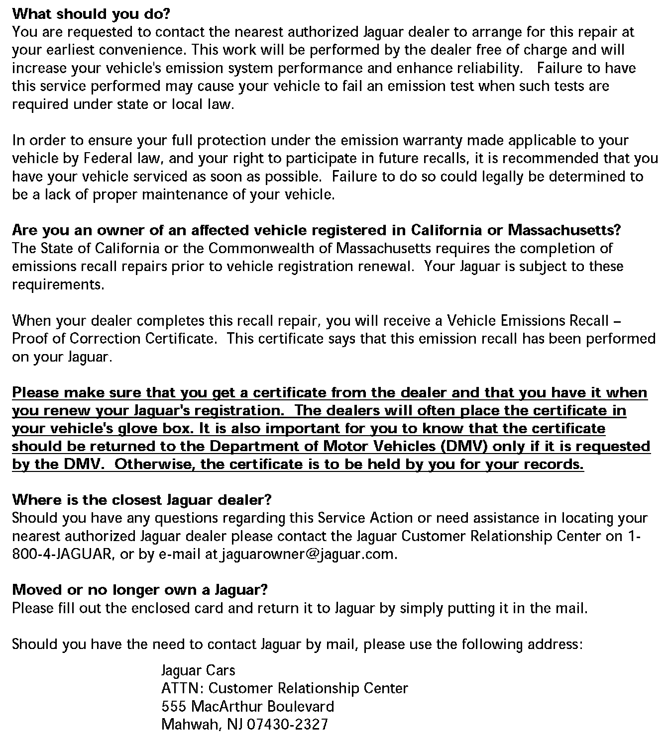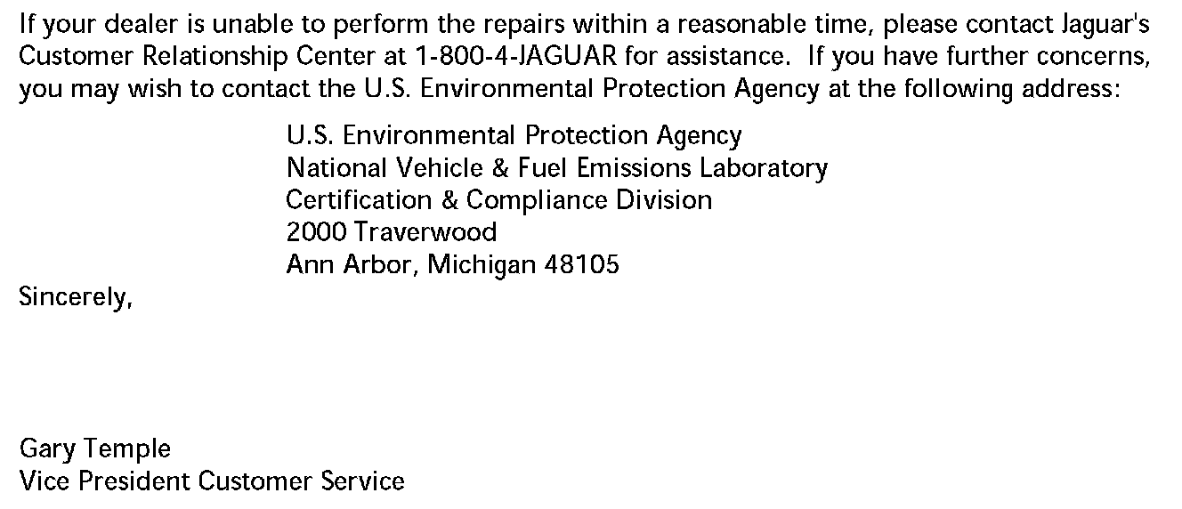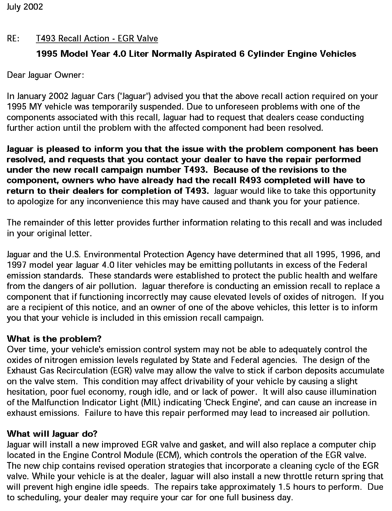 Owner Letter - 1995 Model Year 4.0L Normally Aspirated 6 Cyl.