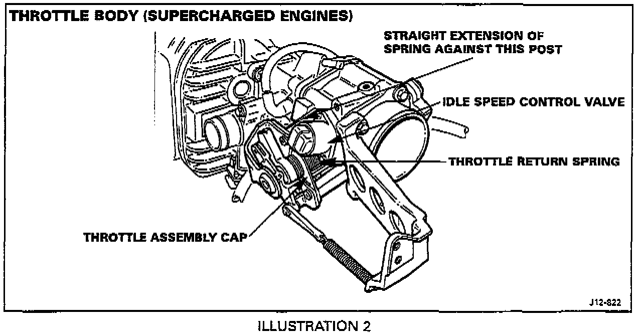 It is important to note that the straight extension of the throttle return spring is against the post next to the idle speed control valve. The straight extension of the spring must rest against this post only.