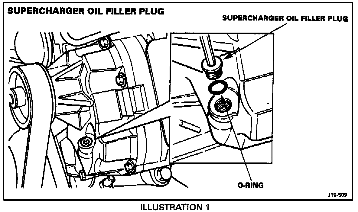 2. Use a 3/16 in Allen wrench to remove the oil filler plug, located at the front of the supercharger (Illustration 1). The plug has an 0-ring attached to prevent possible leakage. Carefully remove the plug to prevent damage to the seal that could result in leaks.