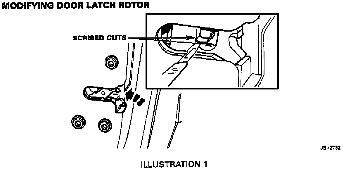 2. Refer to Illustration 1 and use a sharp knife to scribe two cuts across the width of the latch rotor at each end of the curved portion.