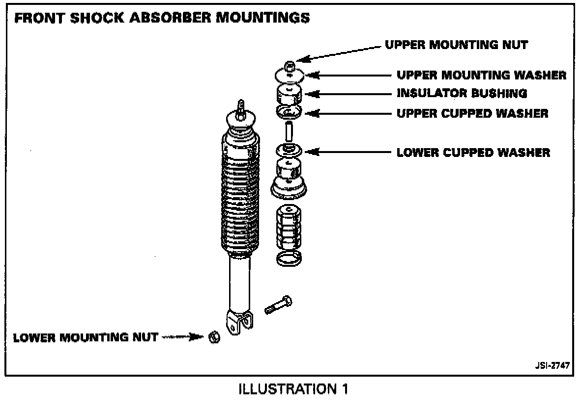2. Check that the shock absorber upper cupped washer (Illustration 1) is fully seated against the inner fender panel in the engine compartment.