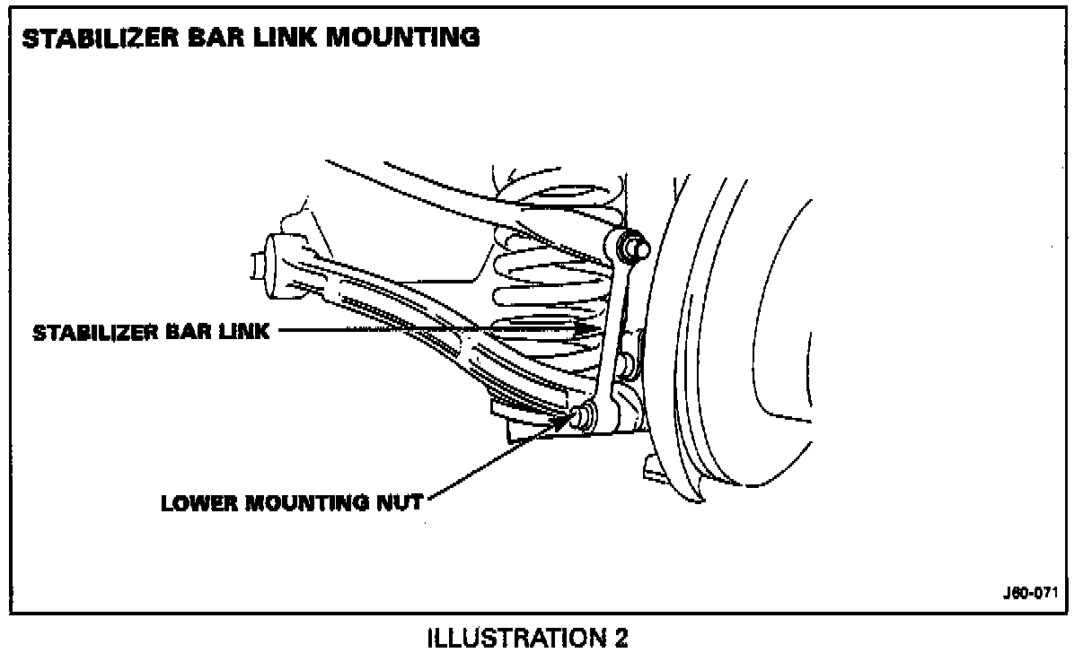 2. Remove the mounting nut (Illustration 2) from the lower mounting of the stabilizer bar link. Discard the nut. Move the link aside to allow access to the lower mounting of the shock absorber.