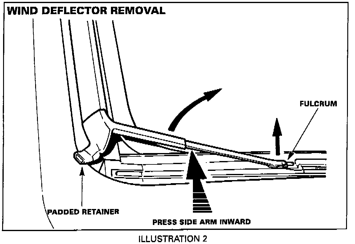 1. Fully open the sliding roof and remove the wind deflector by pressing the side arm inwards, Illustration 2, to release the padded retainer and the fulcrum.