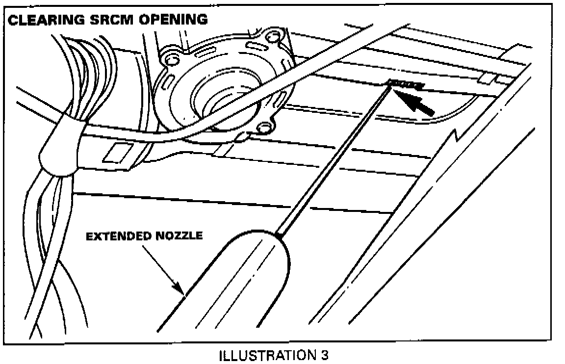 2. Protect the area around the drive tube opening with absorbent material to catch any debris. Use an air-gun with an extended nozzle, Illustration 3, to blow into the hole to remove any residual water.