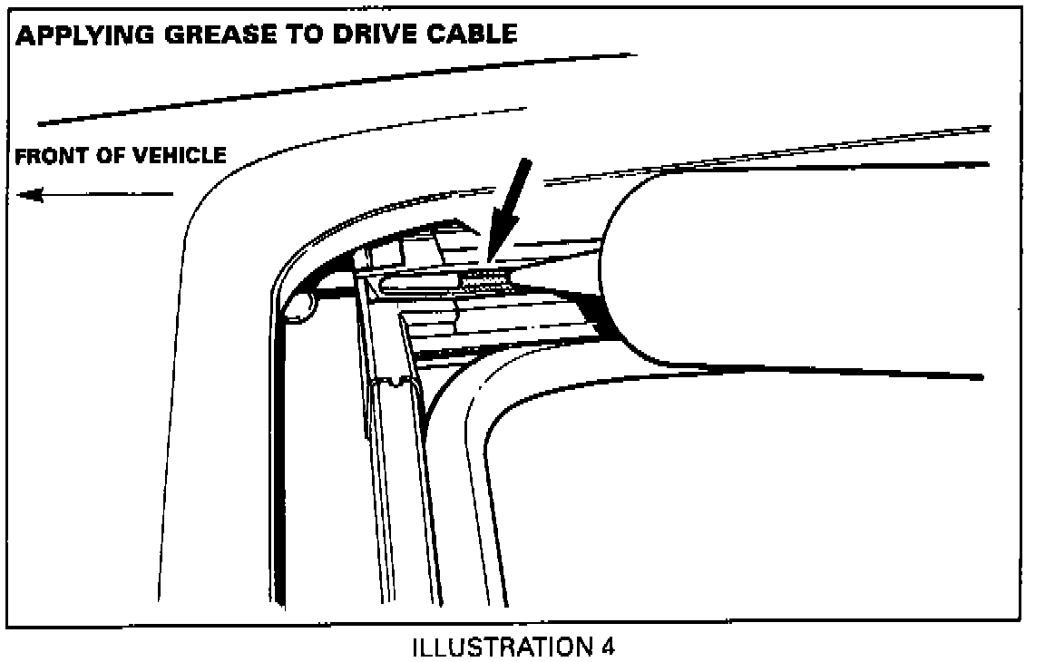 3. Apply grease to the drive cable, Illustration 4, to fill the tube. Operate the sliding roof control switch to gradually close the panel as far as possible while applying grease to the moving cable. Repeat the procedure on the opposite cable.