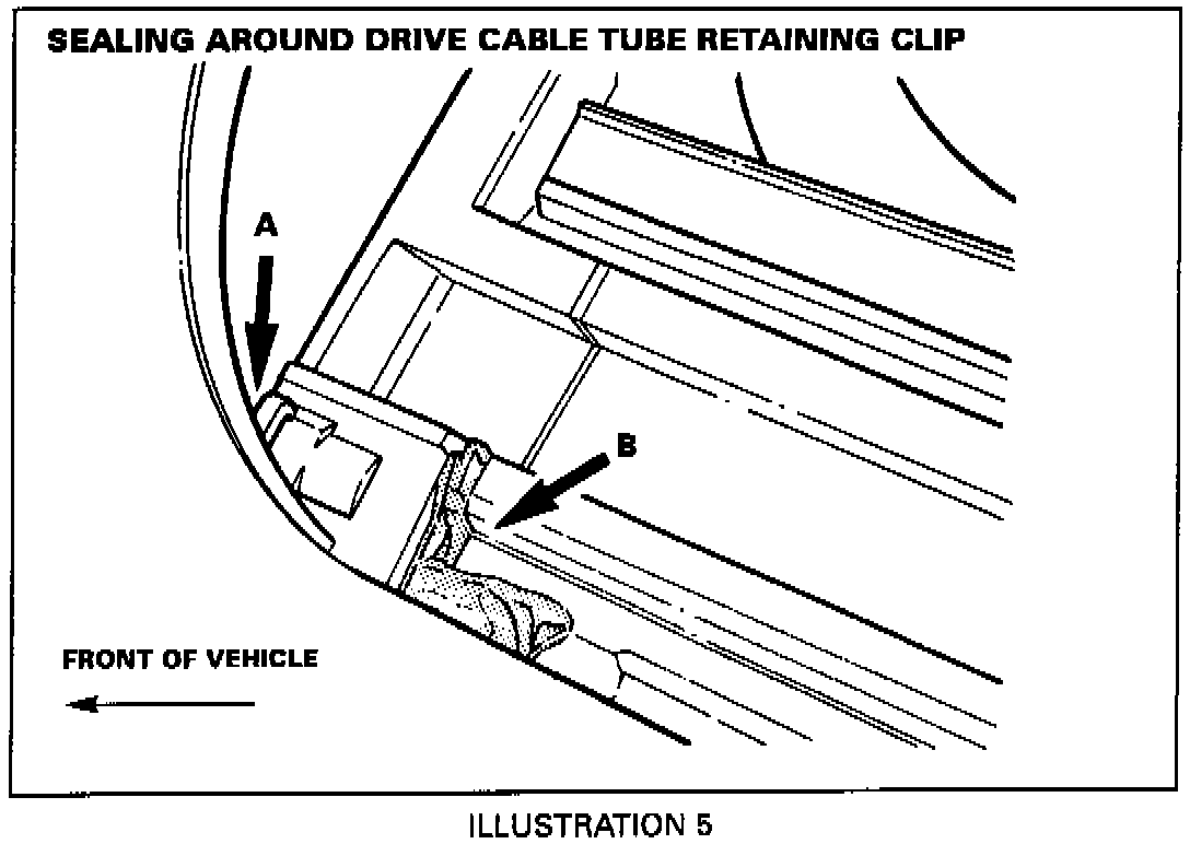 2. Apply sealer to the top of the retaining clip (A, Illustration 5) so that sealer flows into the clip mounting holes, cover the clip and the area in front of and around the drive tube.