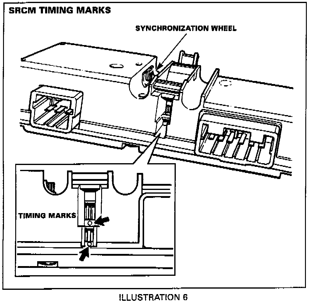 2. Turn the wheel, Illustration 6, until the two white timing marks are aligned. Install the SRCM on the drive tube and clip it into place. Install a new tie strap to hold the SRCM in position.