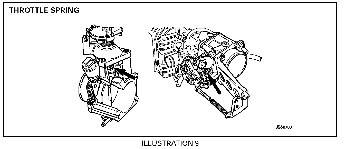 4. Unhook the throttle torsion spring (Illustration 9) from the throttle shaft actuator and then remove the spring and the sleeve from the shaft.