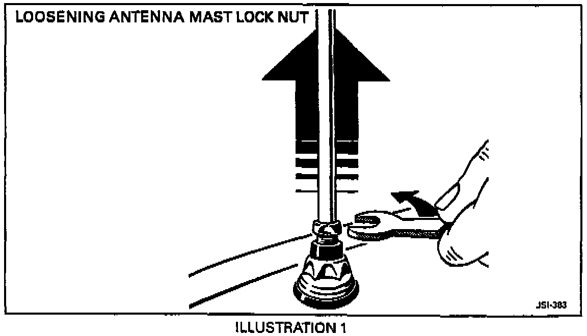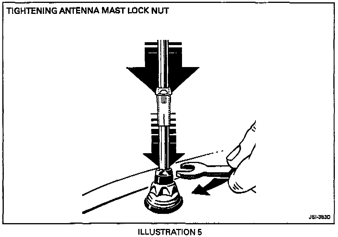 4. After allowing the mast to retract fully, tighten the locking nut (Illustration 5) and check antenna operation. If the motor stops before the antenna is fully retracted, tighten the locking nut, switch the radio on again to fully extend the mast. Switch the radio off again. The mast should now retract fully.