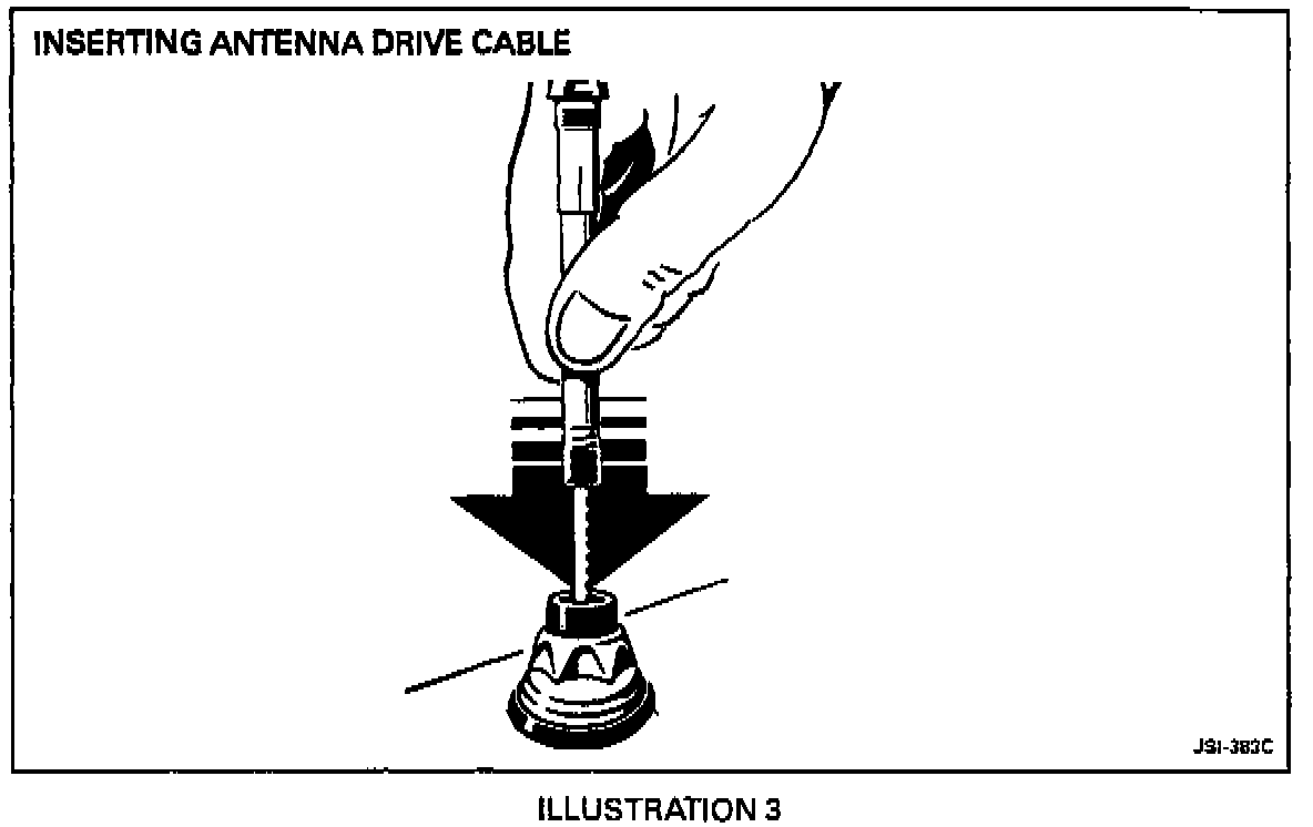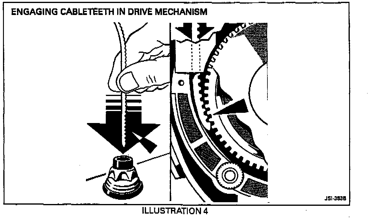 3. Maintain slight pressure on the drive cable, so that as the motor starts, the cable engages with the mechanism, Illustration 4. If the cable does not engage, twist the cable slightly from side to side until it engages.