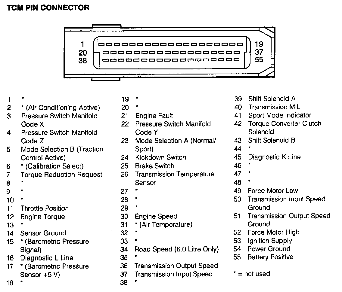 ^ The calibration select input is not utilised (but remains hardwired for future eventualities). To accommodate the calibration differences between the 6.0 litre and the supercharged 4.0 litre models, the respective TCM's are loaded with different software
