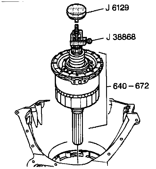 10. Remove the center support assembly and the gear unit (640-672) by lifting J 38868 with J 6129.