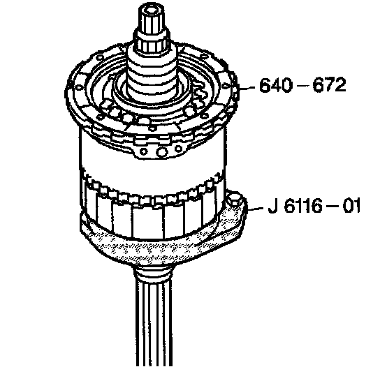 12. Place the center support assembly and the gear unit assembly (640-672) into J 21364-A (not visible in the illustration) and J 6116-01.