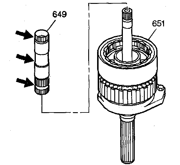 6. Remove the roller clutch assembly (644) from the reaction drum and carrier assembly (651).