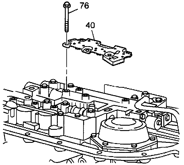 1. Remove the transmission fluid pressure manual valve position switch bolts (76) and the Transmission Fluid Pressure (TFP) valve position switch (40).