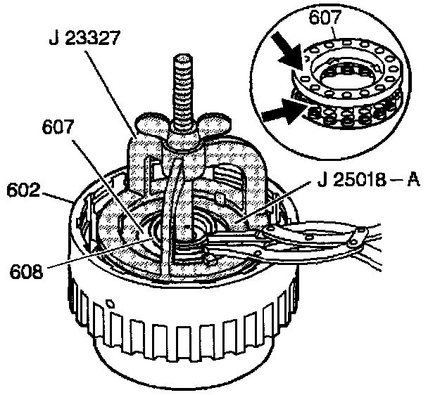 10. Use J 23327 and J 25018-A in order to remove the forward clutch spring retainer ring (608).
