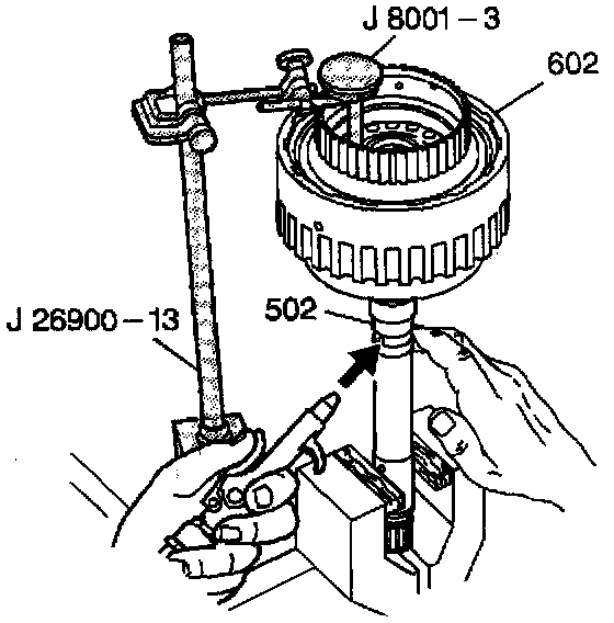 7. Apply air to the forward clutch passage of the turbine shaft (502). The piston travel is 3.07 - 4.72 mm (0.121 - 0.186 inch).