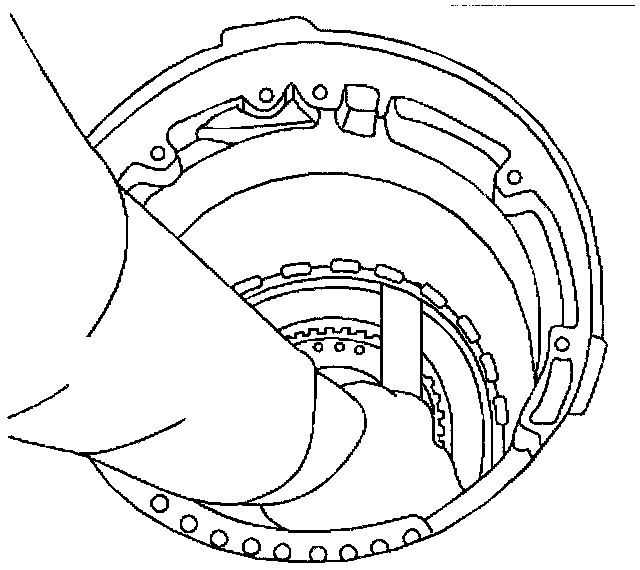 Insert a feeler gauge between the intermediate clutch backing plate (630) and the intermediate clutch backing plate retaining ring (629). Piston travel should be