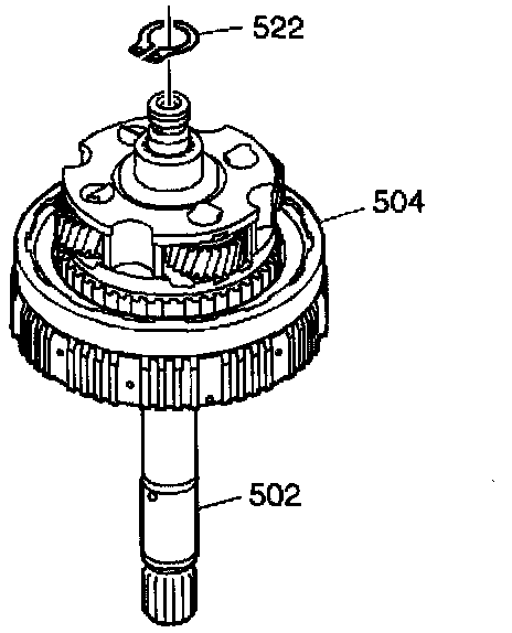 3. Install the turbine shaft (502) through the overrun clutch housing (504).