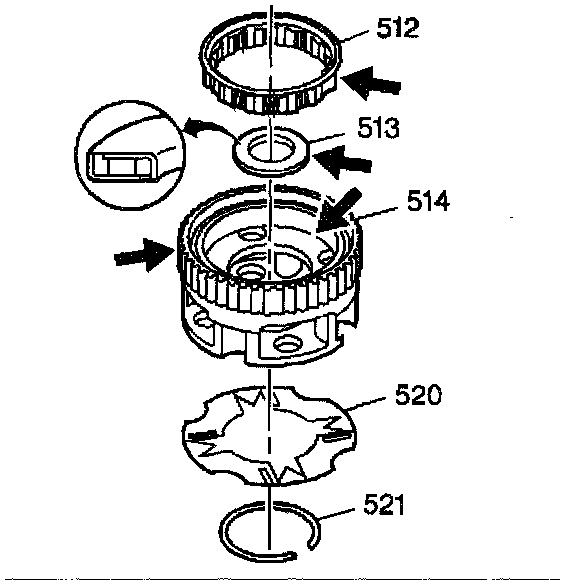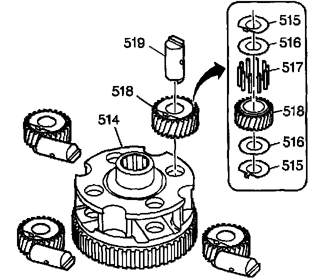 3. Install the overdrive pinion carrier gears (518) and the thrust washers (515, 516), one at a time, into the overdrive carrier (514).