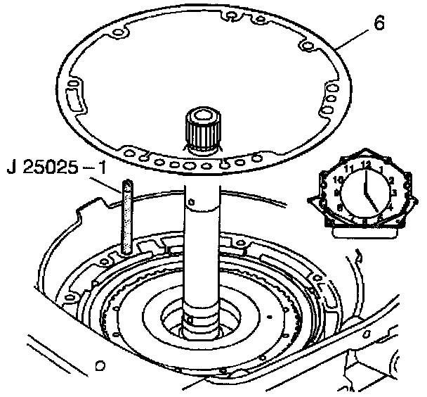 1. Install J 25025-1 at the 12 o'clock and the 5 o'clock positions.