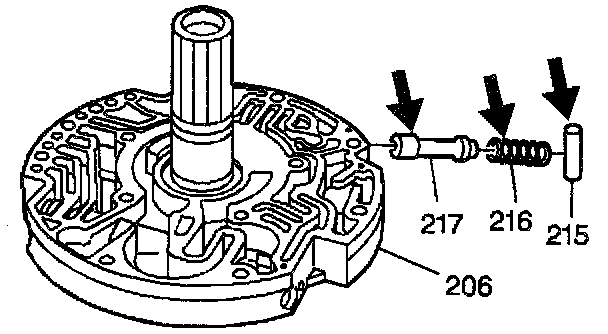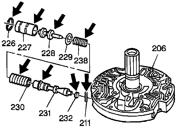 5. Remove the pressure regulator valve inner (238) and outer springs (230).