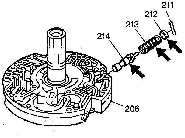 19. Remove the TCC shift valve bore plug retainer ring (221).