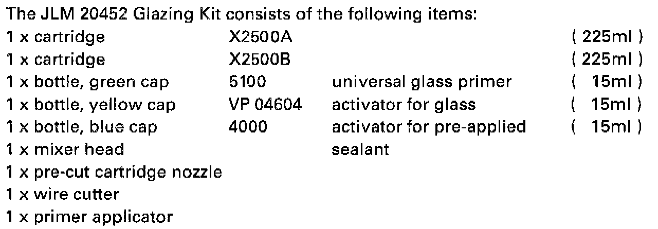A new glass bonding kit, JLM 20452, containing a high modulus, two part, adhesive, supplied by GURIT ESSEX UK Ltd., has been approved for use as the only glass bonding material to be used in the reglazing of Jaguar vehicles. Since the structural integrity of the vehicle depends in part on the bond between the fixed glass and the body, the use of incorrect materials or techniques can affect the structural performance of the vehicle.