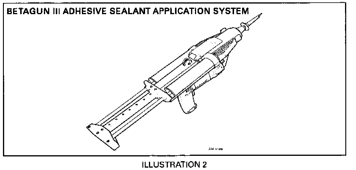 ^ The Betagun, adhesive sealant application system (Illustration 2), is an electric motor driven applicator that applies an equal force to both cartridges of the pack, to ensure a controlled mix of the two ingredients of the adhesive sealant.