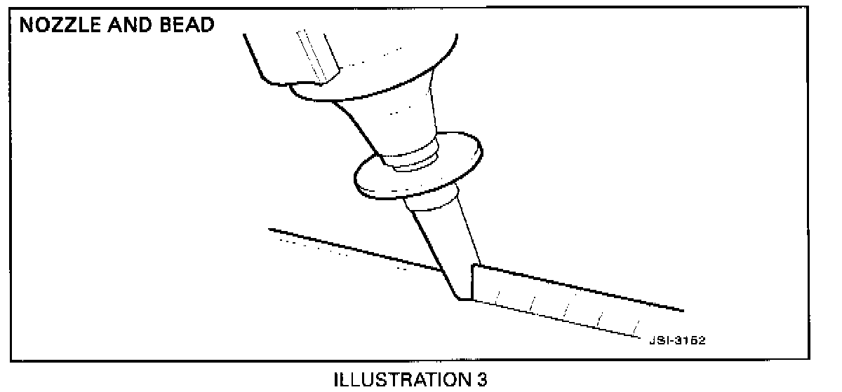 ^ The extruded sealer bead should be triangular in section, (see Illustration 3). The application of the adhesive to the glass must be in a single continuous bead, so always position the glass on a suitable support, so that the operator can move around it to extrude the bead without interruption.