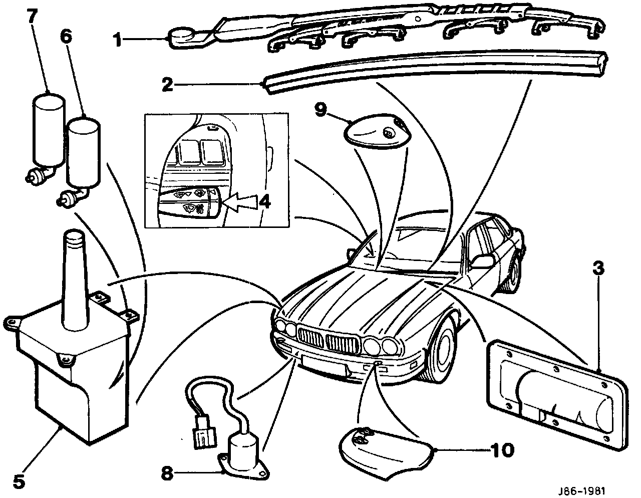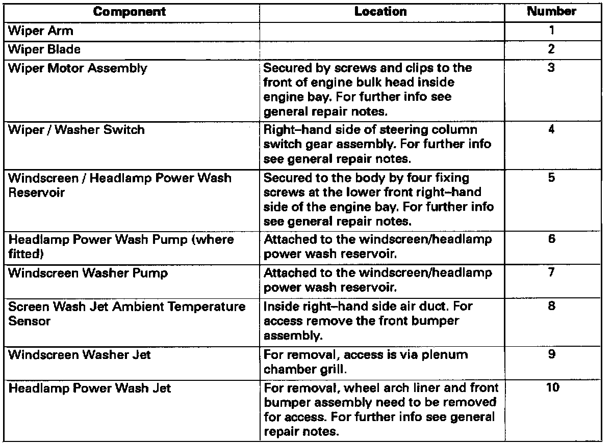 Fig.1 shows the component layout of the wash/wipe equipment, comprising of all items as listed in the table Below. It is important to refer to the general repair notes before commencing with any remove & refit procedures. See 'Service and Repair.' Service and Repair