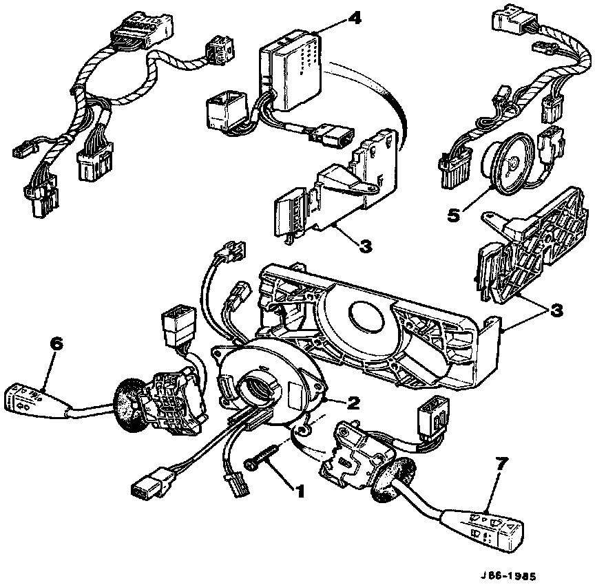 Four fixing screws (1) are used to secure the column switch assembly to the steering column. The assembly comprises, a cancellation/cassette module (2), a mounting bracket (3) with installed dimmer module (4) and audible warning speaker (5), a indicator arm switch (6) and a wiper arm switch (7).