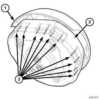 4. Using a sharp utility knife, carefully cut through the lower edge of each of the twelve trim cover (1) windows at the cut lines (3) on each side of the twelve inward pointing hooks of the airbag housing (2). Use extreme care to prevent any scraps from entering and becoming lost within the airbag housing or cushion.