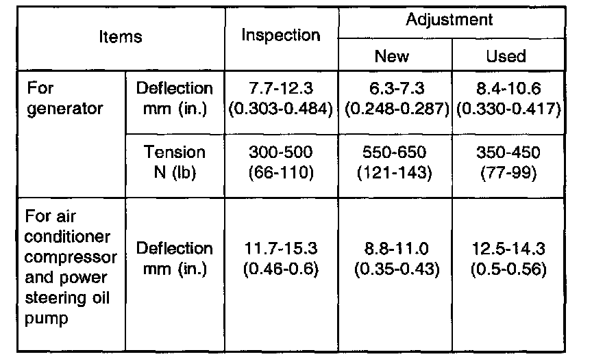 2 When a new belt is installed, adjust the tension to the central value of the standard range Indicated under "New" in the above table. And then let the engine idle for 5 minutes or more, and check the standard value indicated under "Inspection".