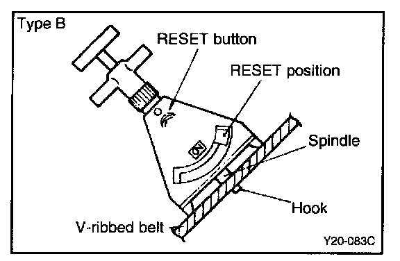 2. Apply 100 N (22 lbs.) force to the belt back midway between the pulleys as shown in the illustration, measure the amount of deflection with a tension gauge.