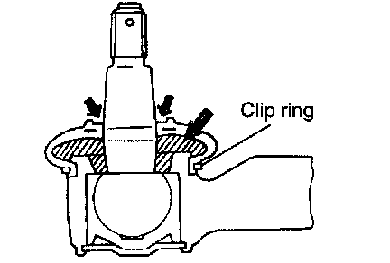28. Fill the dust cover inner side and lip with the specified multipurpose grease, and fix the dust cover in position with the clip ring attached in the groove of the tie rod end.