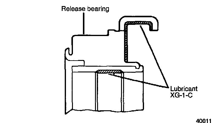 2. Fill the groove in the release bearing hub with a Lubricant XG-1-C, or equivalent. Also, apply a light film of lubricant on the release fork contact area. The lubricant areas are shown in the right illustration.