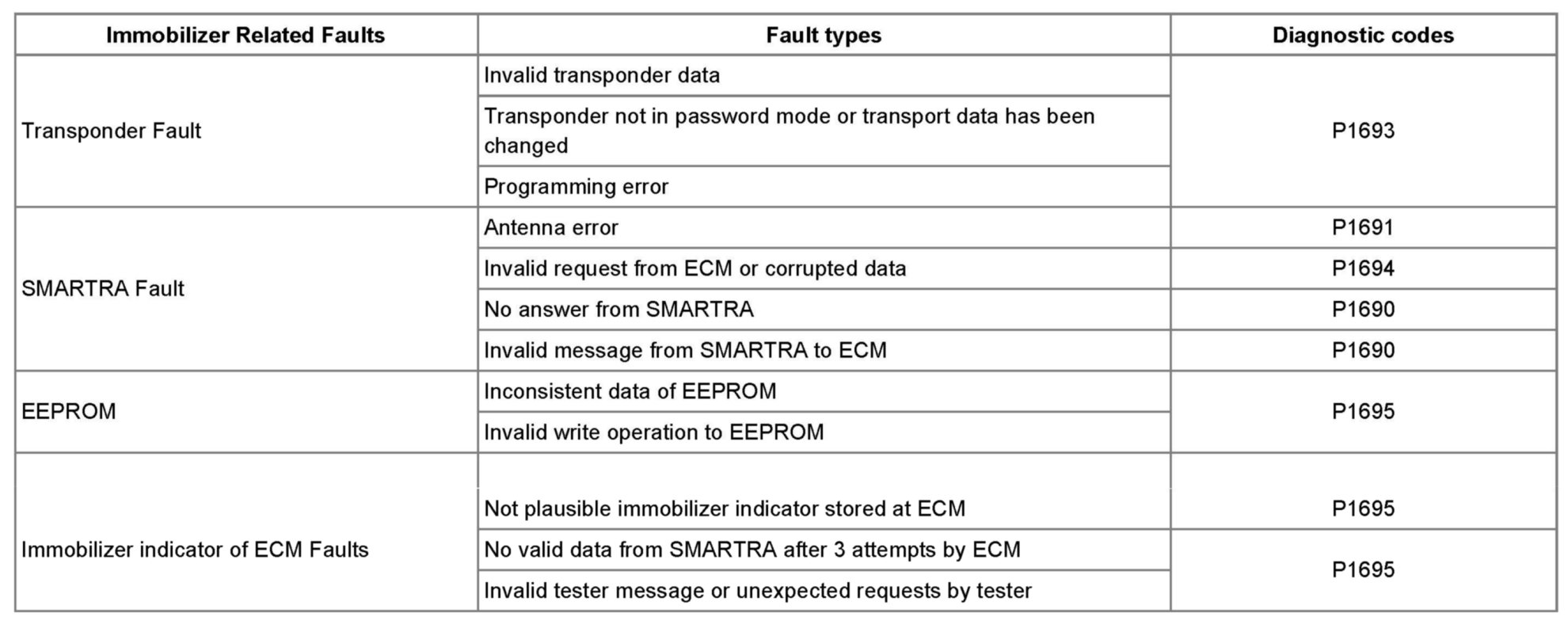 There are four different faults that are assigned to the immobilizer system. Every fault is broken down into four different types (circuit malfunction, circuit range / performance problem, low input, high input). The table shows the assignment of immobilizer related faults to each type.