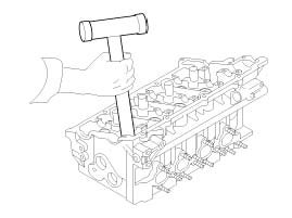 5) Lightly tap the end of each valve stem two or three times with the wooden handle of a hammer to ensure proper seating of the valve and retainer lock.