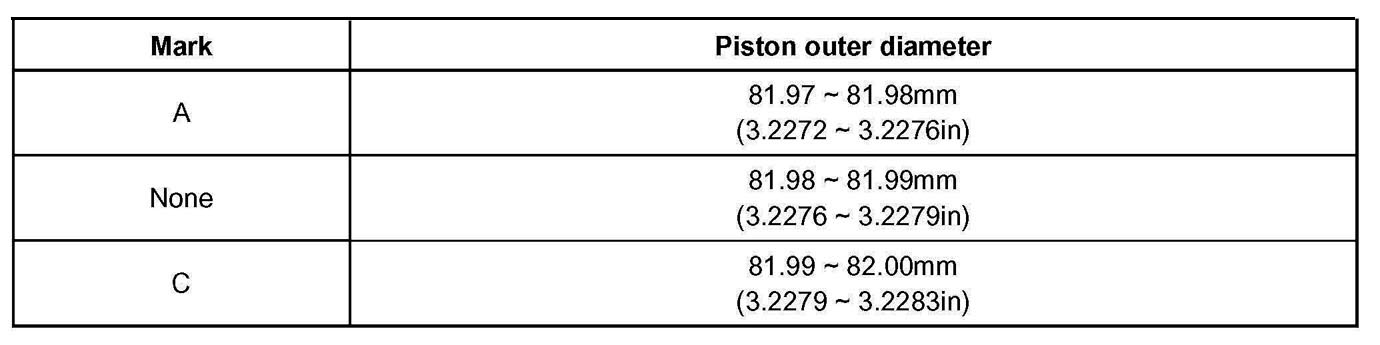 New bore size = piston O.D + 0.02 to 0.04 mm (0.0008 to 0.0016 inch) (clearance between piston and cylinder) - 0.01 mm (0.0004 inch) (honing margin.)