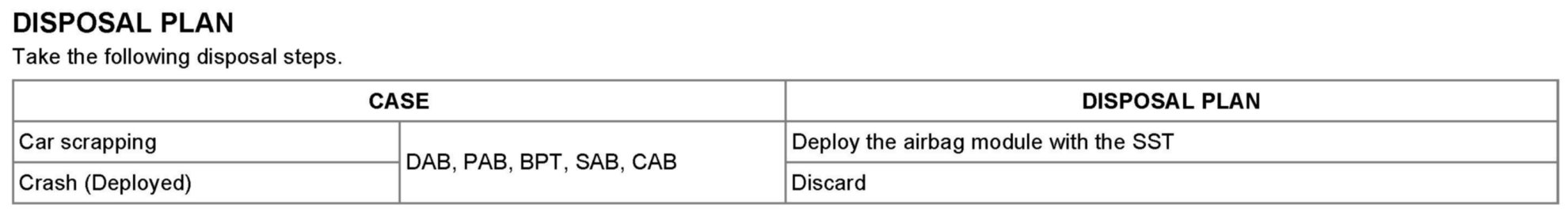After deployment, the airbag module should be disposed of in the same manner as any other scrap part, except thatch the following points should be carefully noted during disposal.