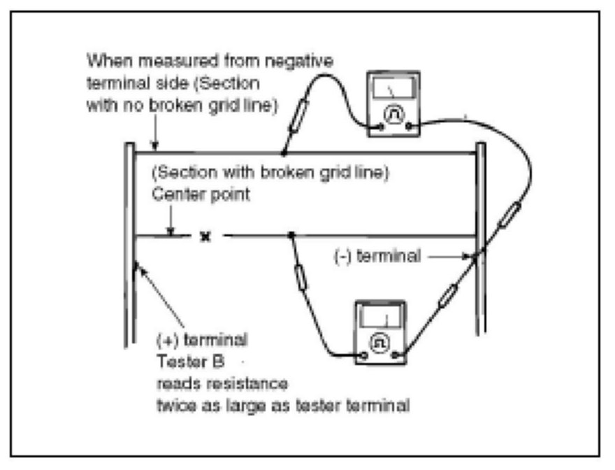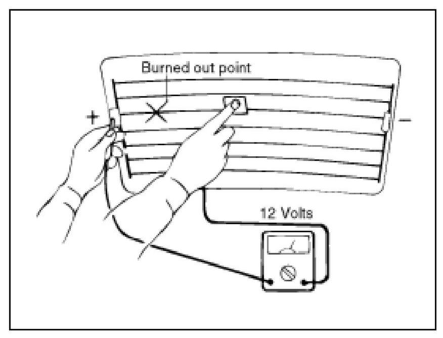 5. Use an ohmmeter to measure the resistance of each heater line between a terminal and the center of a grid line, and between the same terminal and the center of one adjacent heater line. The section with a broken heater line will have a resistance twice as that in other sections. In the affected section, move the test lead to a position where the resistance sharply changes.