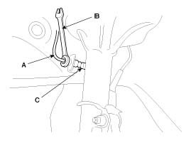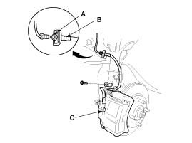 4. Remove the connector bolt (C), and disconnect the brake hose from the caliper.
