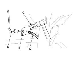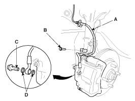 6. Install the brake hose (A) on the knuckle with 12 mm (0.47 inch) flange bolt (B) first, then connect the brake hose to the caliper with the connector bolt (C) and new sealing washers (D).