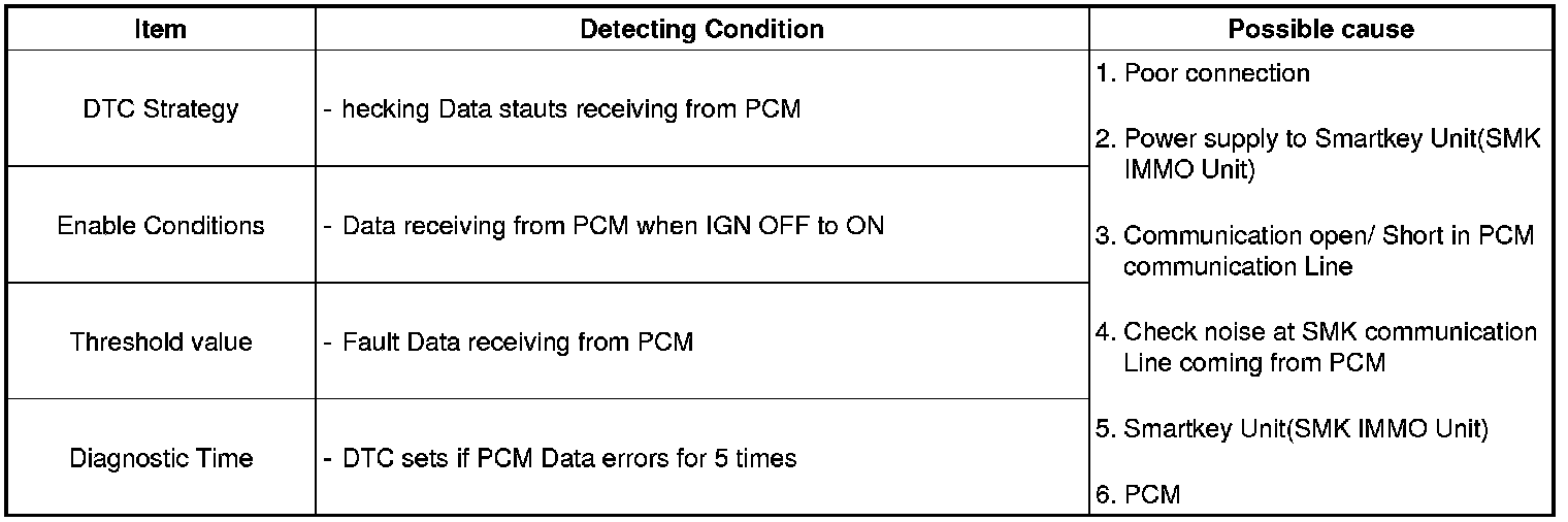Smart key Module sets DTC B1625 if Data from PCM is error such as check sum error, Data Frame error, ID Unknown error, Data length error and Time out error.