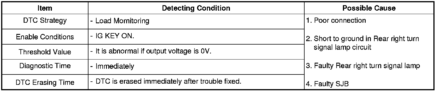 This code is set when Rear right turn signal lamp circuit is shorted to ground for more than 150 ms during right turn signal lamp operating.