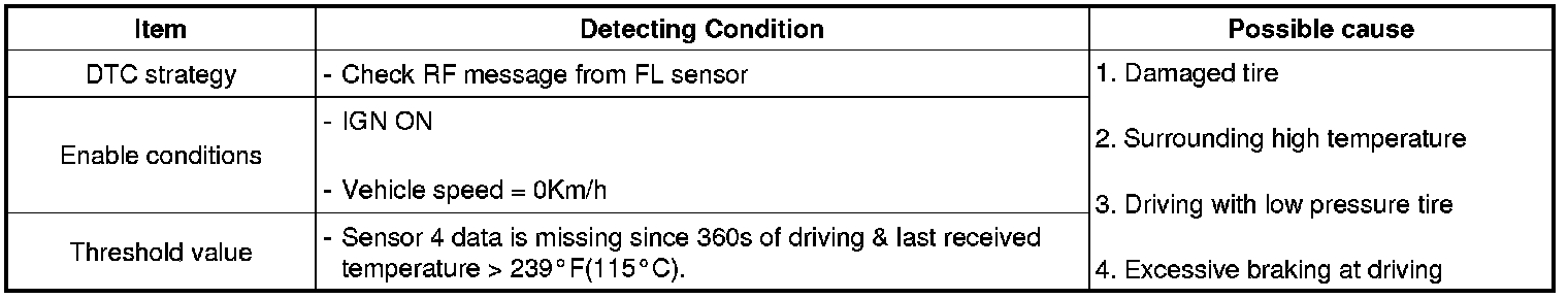 The TPMS ECU monitors the RF signal of the sensor and if its temperature is more than 239 °F (115 °C), this DTC is set.