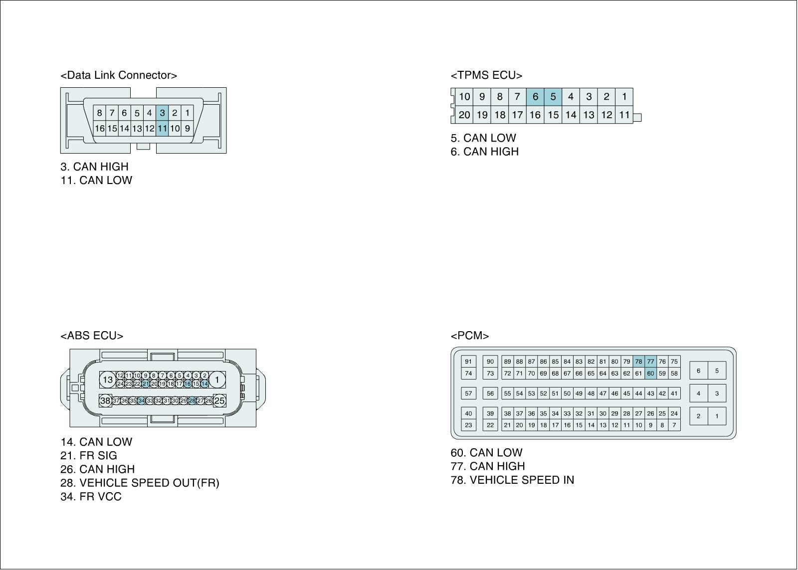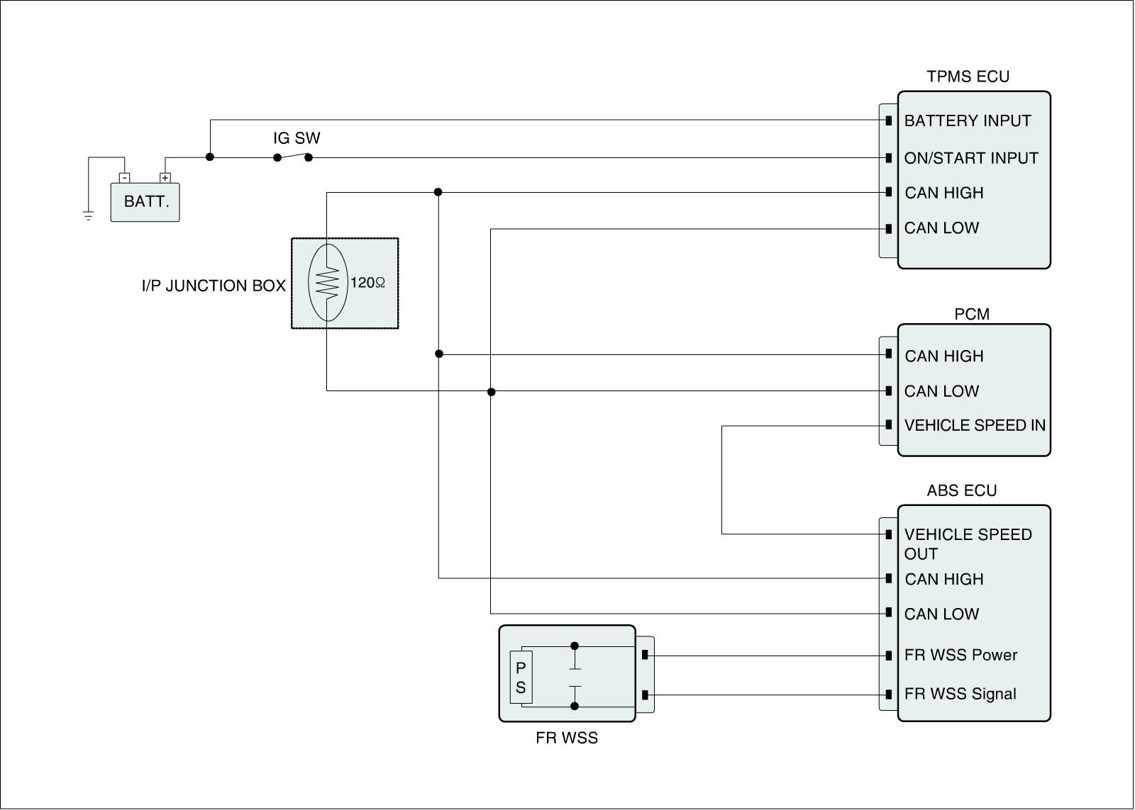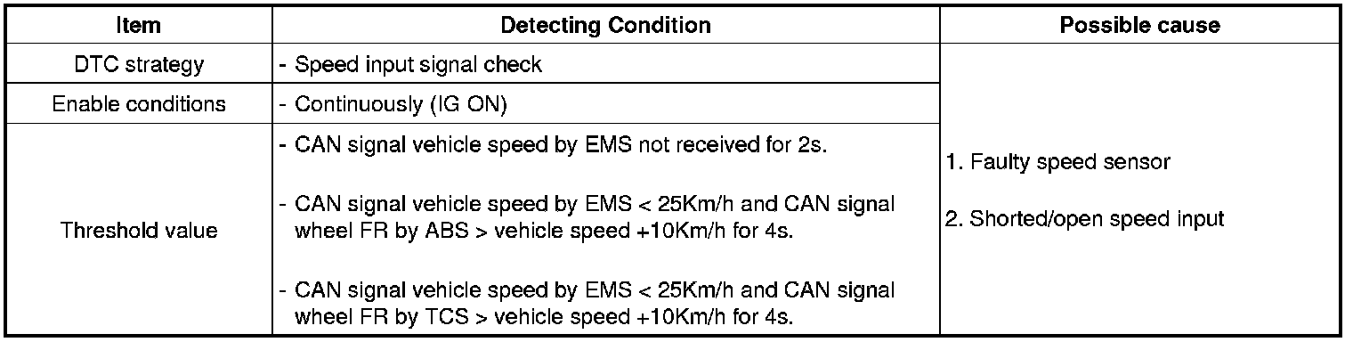 Various TPMS functions rely on an accurate vehicle speed. Three speed signals (ABS1 FR wheel, EMS1 speed signal, TCS5 FR wheel) are compared to acquire the correct vehicle speed. If the three signals do not match, a DTC will be set and the TPMS Warning indicator will turn on.